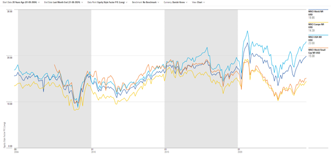 Amerikanske aktier er endnu dyrere med P/E på 23, men handles historisk set dyrere end fx europæiske aktier med aktuel P/E på 14,4. Det er ikke nødvendigvis et issue, da det afspejler den stærkere indtjeningsvækst i amerikanske selskaber.