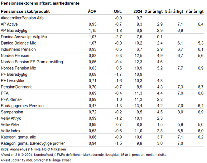 Den positive udvikling på finansmarkederne smittede af på danskernes pensionsopsparinger. Tabellen viser bl.a. 2024-afkastet suppleret af løbende afkast over længere horisonter for markedsrenteprodukter med middel risiko og mellemlang horisont til pensionering. Løbende afkast opgjort pr. 31/10-2024.